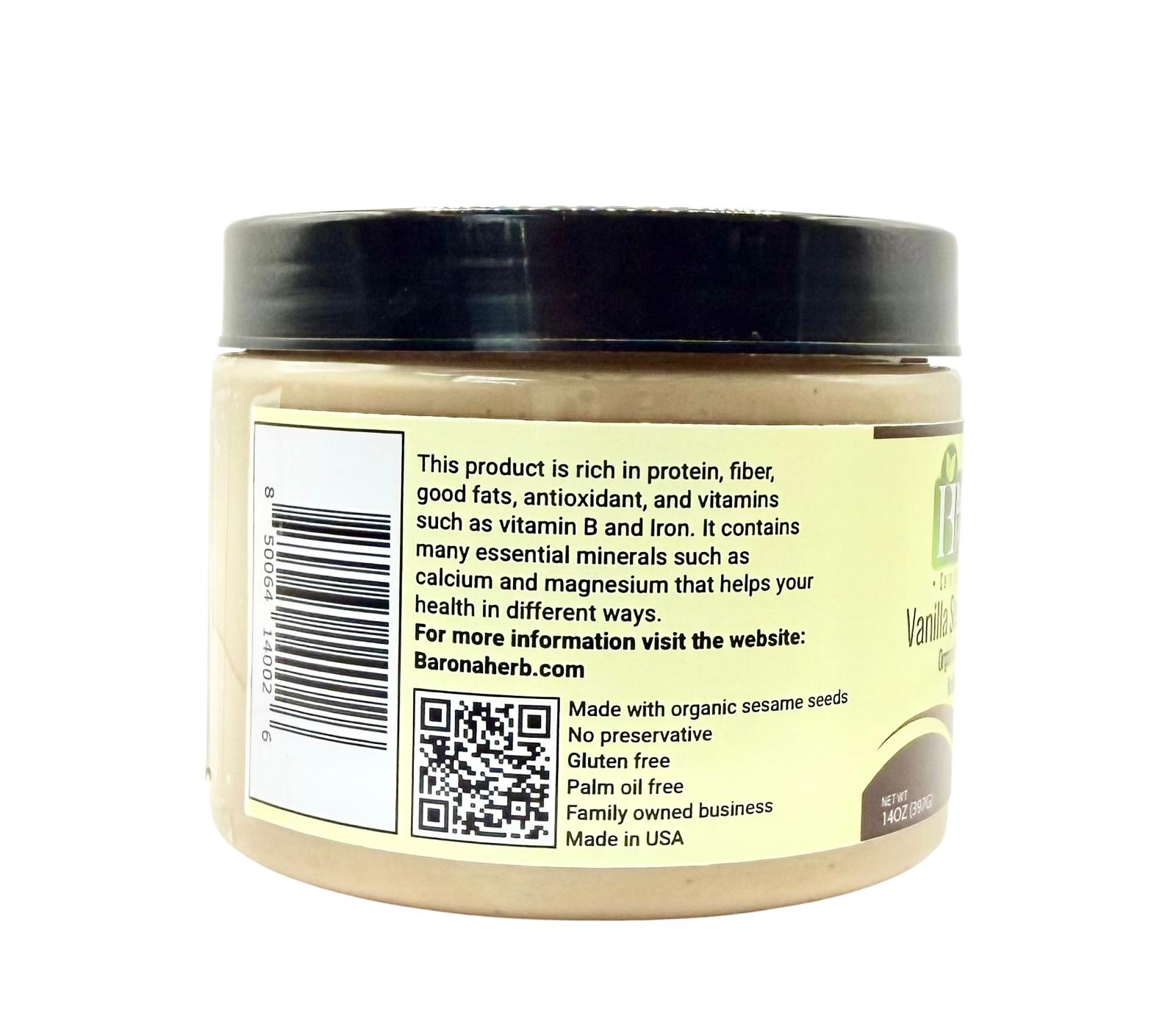 Savor the sweet, creamy taste of vanilla in every spoonful. This Vanilla sesame spread is smooth, rich, and full of nutrients to keep you energized. First, it gives you plant-based protein. Next, it adds fiber and healthy fats. These help you feel full. They also keep you active all day. Plus, antioxidants protect your body from everyday stress.